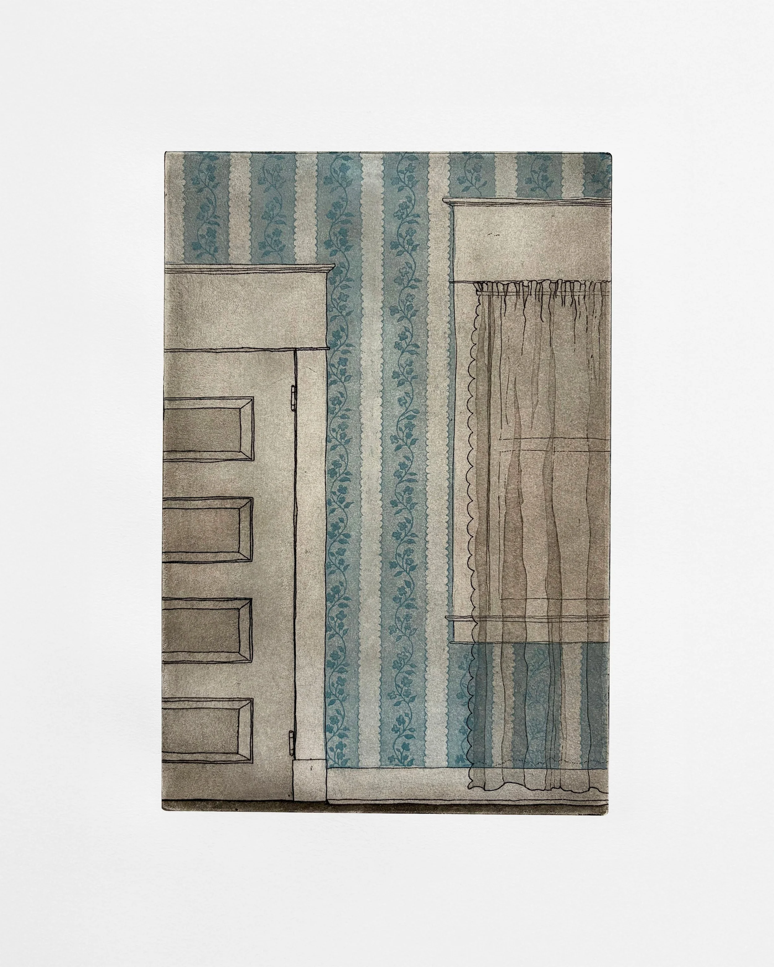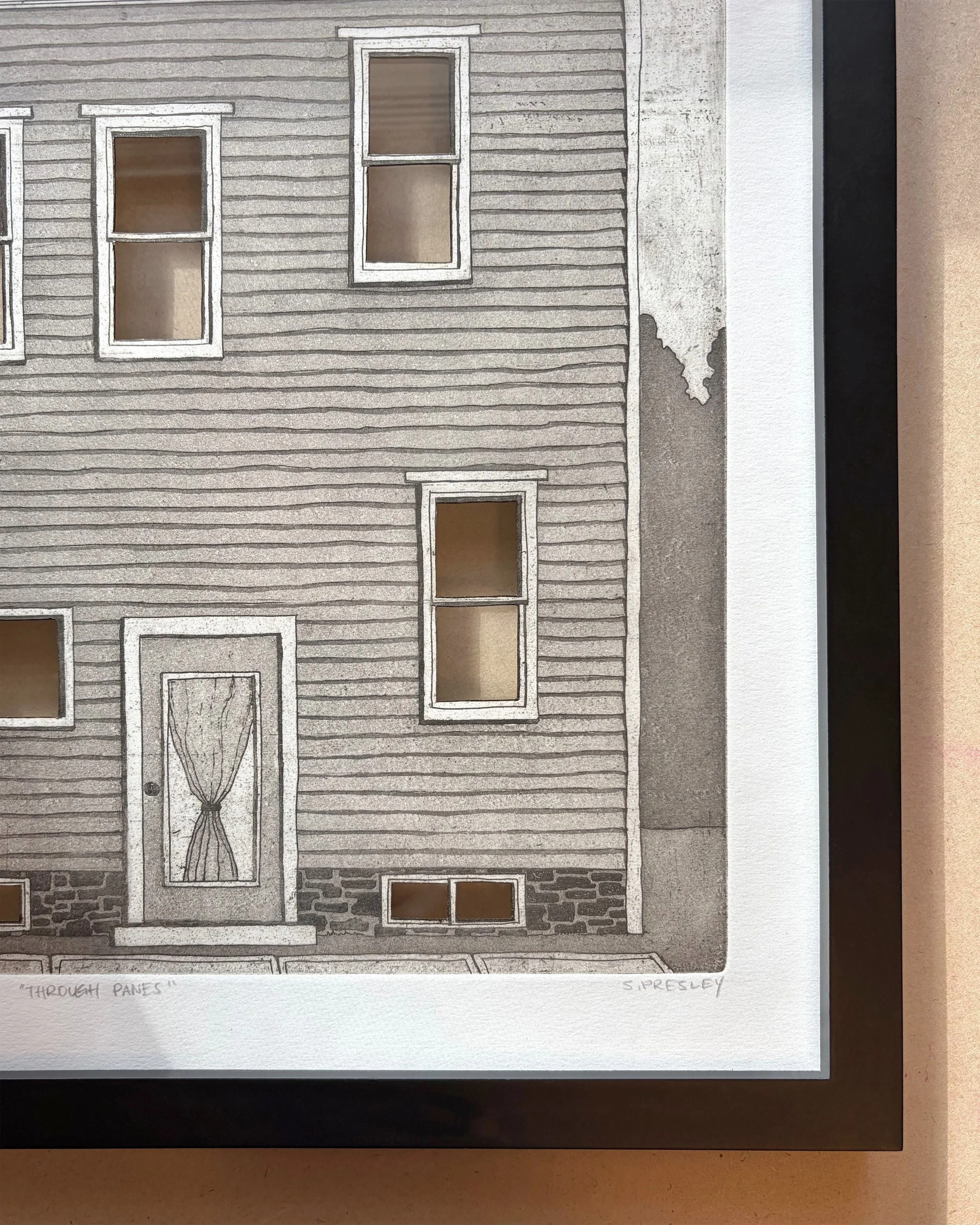 Through Panes, 12” x 12” etching with window cutouts, 2025
