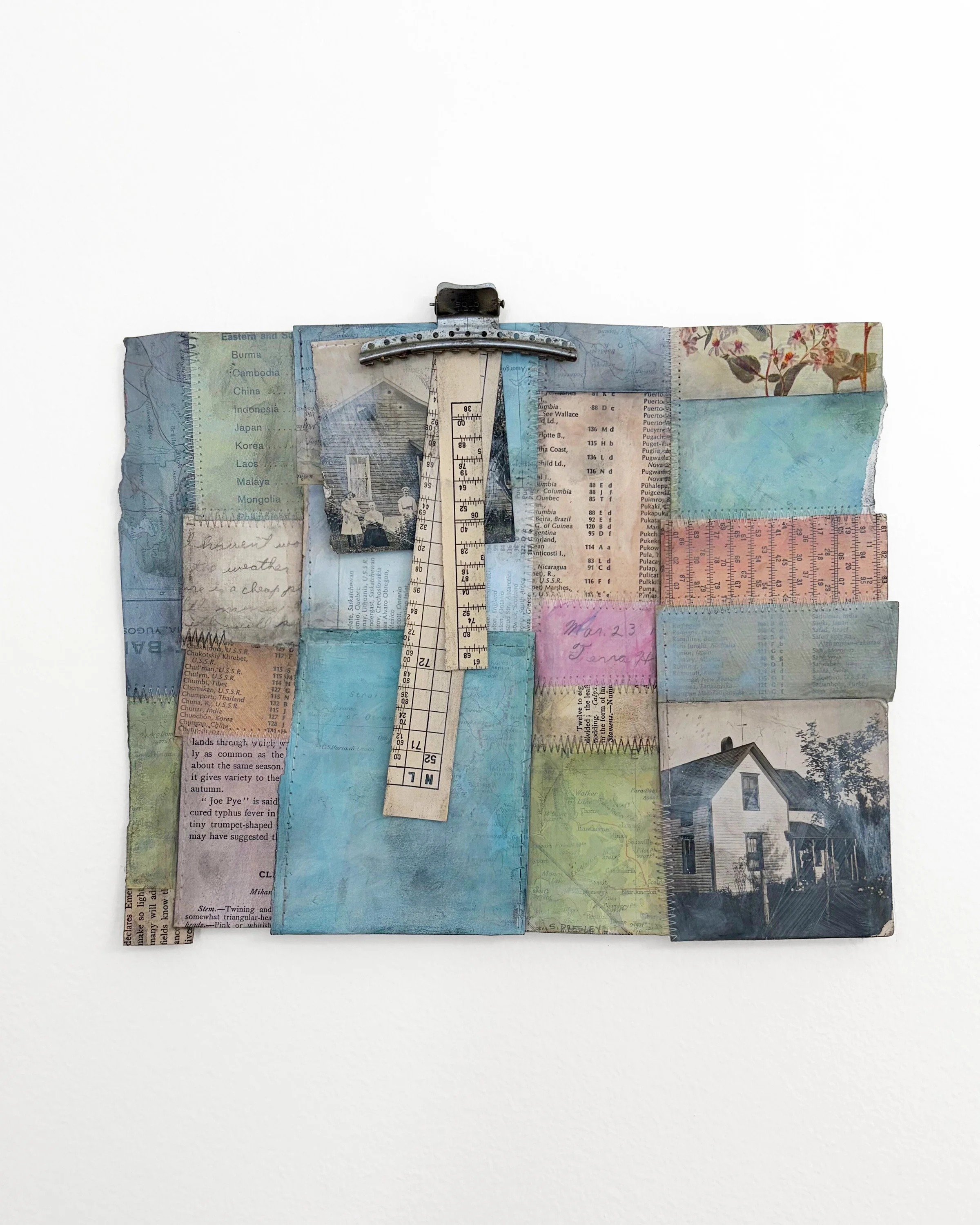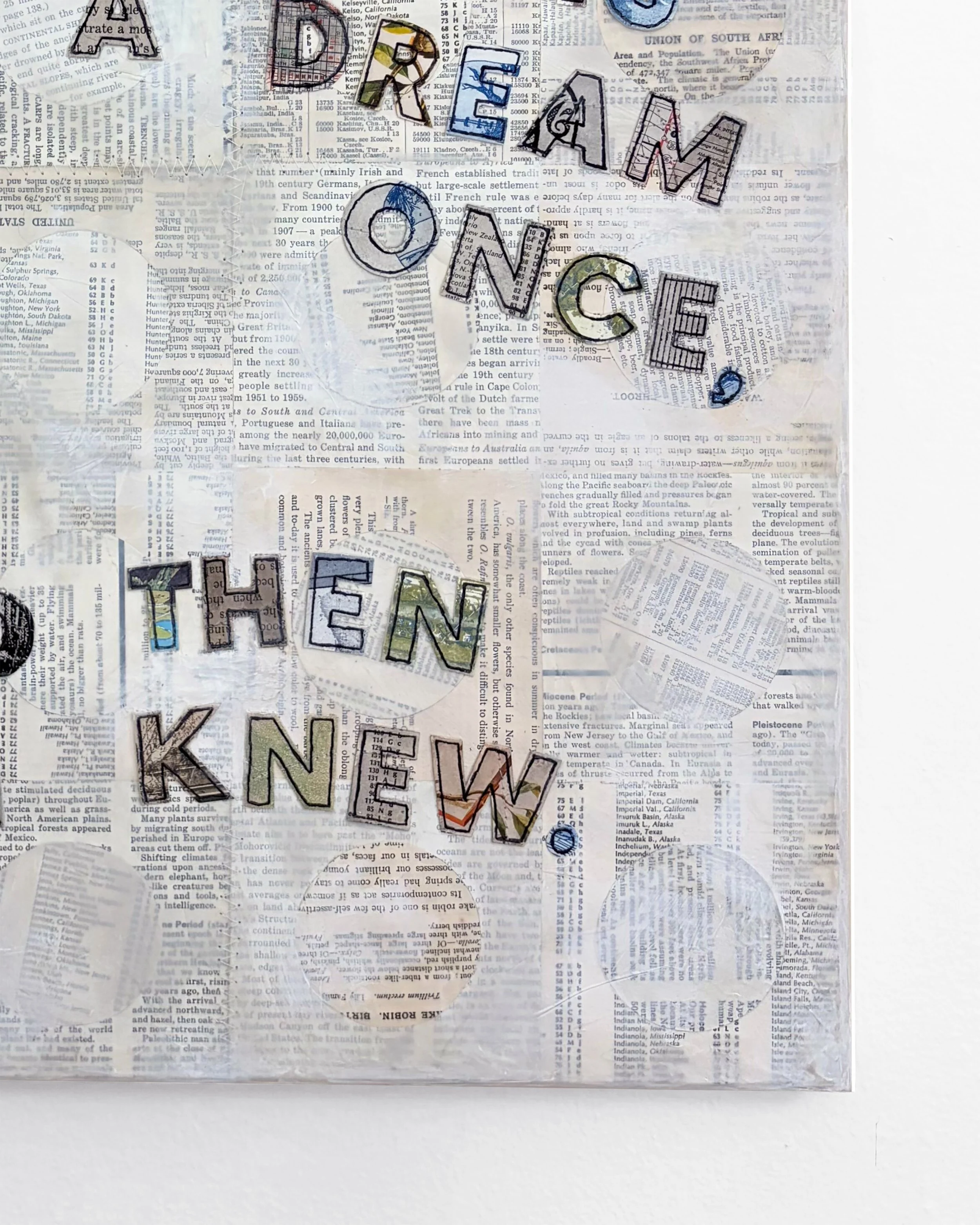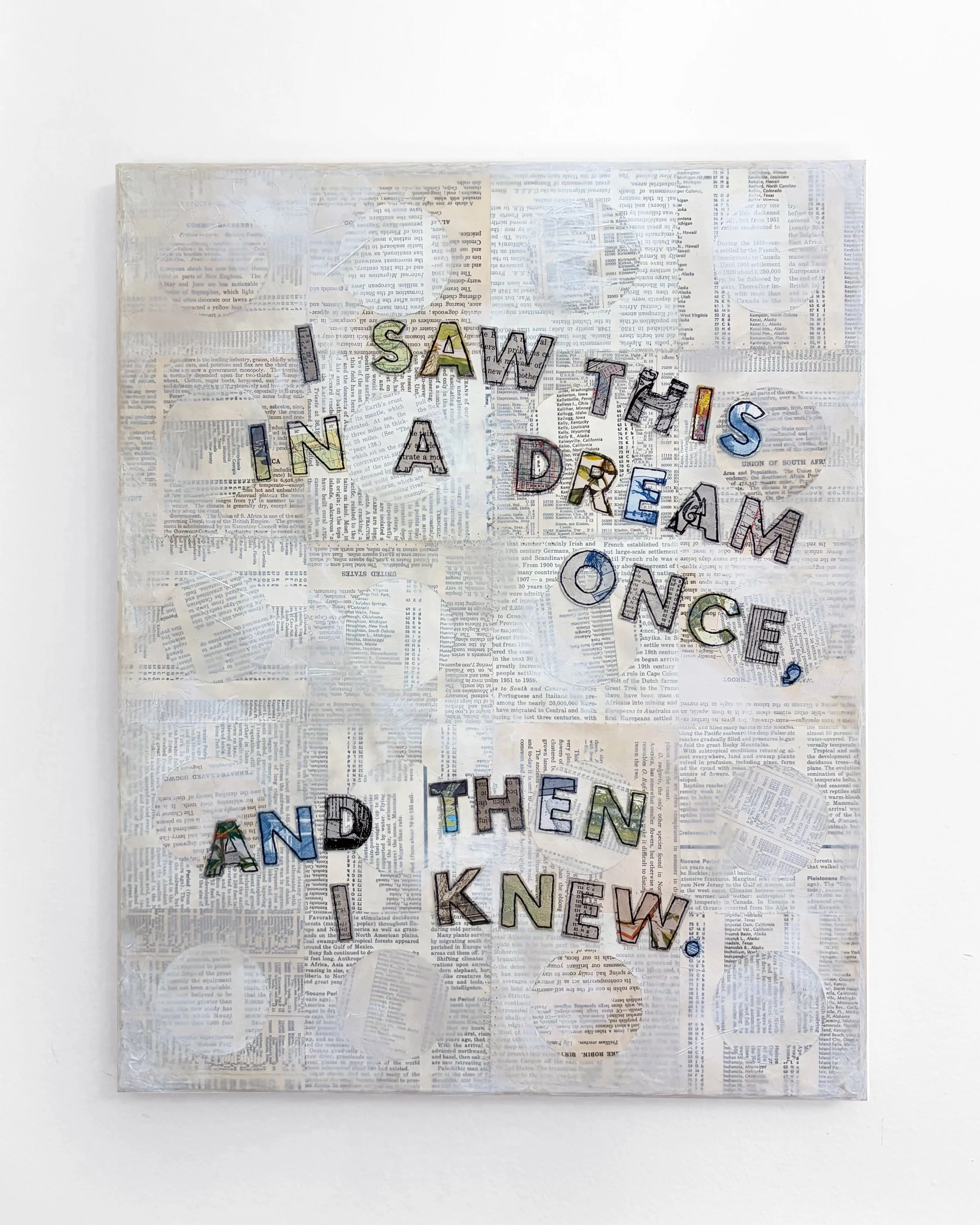I Knew, 16" x 20" sewn collage with gel medium on panel, 2024