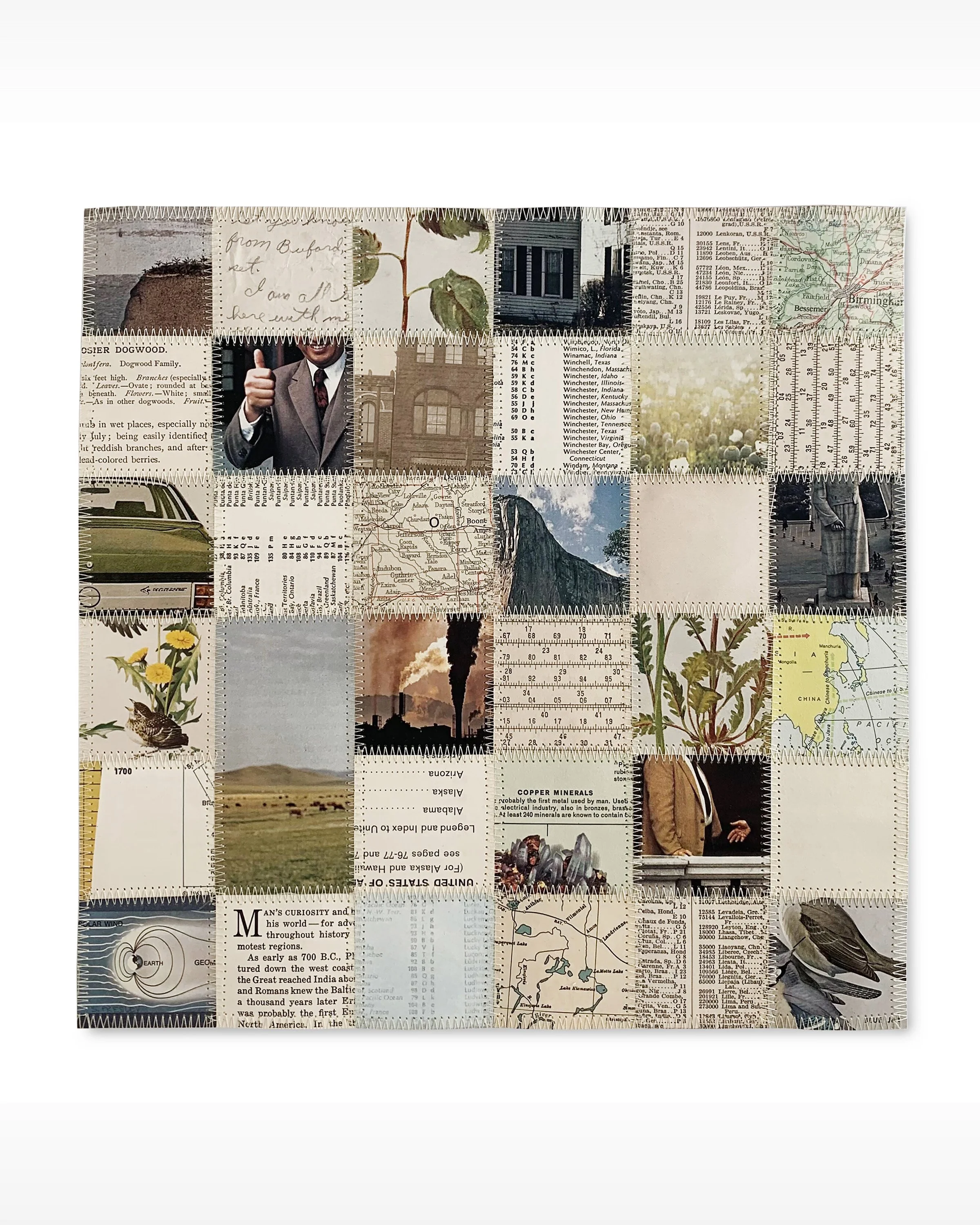 Man's Curiosity, 12" x 12" sewn collage, 2025